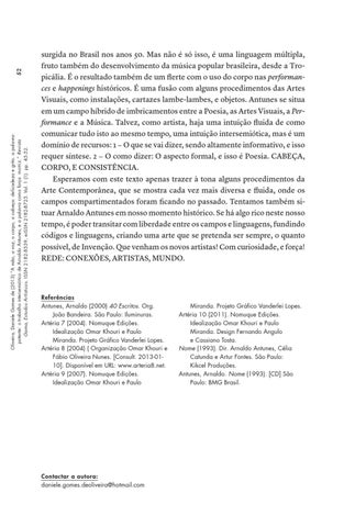 52 Oliveira, Daniele Gomes de (2013) “A mão, a voz, o corpo, a cabeça: delicadeza e grito. a palavra: potente: o trabalho intersemiótico de Arnaldo Antunes, e a palavra como força motriz.” Revista Gama, Estudos Artísticos. ISSN 2182-8539, e-ISSN 2182-8725. Vol. 1 (1): pp. 45-52.