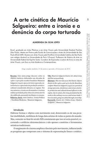 53 Lopes, Almerinda da Silva (2013) “A arte cinética de Maurício Salgueiro: entre a ironia e a denúncia do corpo torturado.” Revista Gama, Estudos Artísticos. ISSN 2182-8539, e-ISSN 2182-8725. Vol. 1 (1): pp. 53-58.