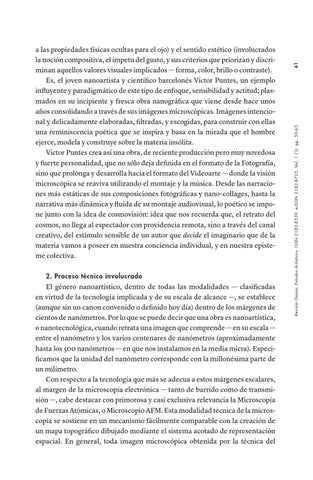 a las propiedades físicas ocultas para el ojo) y el sentido estético (involucrados la noción compositiva, el ímpetu del gusto, y sus criterios que priorizan y discriminan aquellos valores visuales implicados — forma, color, brillo o contraste). Es, el joven nanoartista y científico barcelonés Víctor Puntes, un ejemplo influyente y paradigmático de este tipo de enfoque, sensibilidad y actitud; plasmados en su incipiente y fresca obra nanográfica que viene desde hace unos años consolidando a través de sus imágenes microscópicas. Imágenes intencional y delicadamente elaboradas, filtradas, y escogidas, para construir con ellas una reminiscencia poética que se inspira y basa en la mirada que el hombre ejerce, modela y construye sobre la materia insólita. Víctor Puntes crea así una obra, de reciente producción pero muy novedosa y fuerte personalidad, que no sólo deja definida en el formato de la Fotografía, sino que prolonga y desarrolla hacia el formato del Videoarte — donde la visión microscópica se reaviva utilizando el montaje y la música. Desde las narraciones más estáticas de sus composiciones fotográficas y nano-collages, hasta la narrativa más dinámica y fluida de su montaje audiovisual, lo poético se impone junto con la idea de cosmovisión: idea que nos recuerda que, el retrato del cosmos, no llega al espectador con providencia remota, sino a través del canal creativo, del estímulo sensible de un autor que decide el imaginario que de la materia vamos a poseer en nuestra conciencia individual, y en nuestra episteme colectiva.