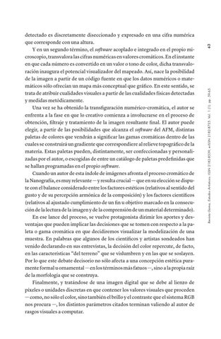 detectado es discretamente diseccionado y expresado en una cifra numérica que corresponde con una altura. Y en un segundo término, el software acoplado e integrado en el propio microscopio, transvalora las cifras numéricas en valores cromáticos. En el instante en que cada número es convertido en un valor o tono de color, dicha transvaloración inaugura el potencial visualizador del mapeado. Así, nace la posibilidad de la imagen a partir de un código fuente en que los datos numéricos o matemáticos sólo ofrecían un mapa más conceptual que gráfico. En este sentido, se trata de atribuir cualidades visuales a partir de las cualidades físicas detectadas y medidas metódicamente. Una vez se ha obtenido la transfiguración numérico-cromática, el autor se enfrenta a la fase en que lo creativo comienza a involucrarse en el proceso de obtención, filtraje y tratamiento de la imagen resultante final. El autor puede elegir, a partir de las posibilidades que alcanza el software del AFM, distintas paletas de colores que vendrán a significar las gamas cromáticas dentro de las cuales se construirá un gradiente que correspondiere al relieve topográfico de la materia. Estas paletas pueden, distintamente, ser confeccionadas y personalizadas por el autor, o escogidas de entre un catálogo de paletas predefinidas que se hallan programadas en el propio software. Cuando un autor de esta índole de imágenes afronta el proceso cromático de la Nanografía, es muy relevante — y resulta crucial — que en su elección se dispute con el balance considerado entre los factores estéticos (relativos al sentido del gusto y de su percepción armónica de la composición) y los factores científicos (relativos al ajustado cumplimiento de un fin u objetivo marcado en la consecución de la lectura de la imagen y de la comprensión de un material determinado). En ese lance del proceso, se vuelve protagonista dirimir los aportes y desventajas que pueden implicar las decisiones que se tomen con respecto a la paleta o gama cromática en que decidiremos visualizar la modelización de una muestra. En palabras que algunos de los científicos y artistas sondeados han venido declarando en sus entrevistas, la decisión del color repercute, de facto, en las características “del terreno” que se vislumbren y en las que se soslayen. Por lo que este debate decisorio no sólo afecta a una concepción estética puramente formal u ornamental — en los términos más fatuos —, sino a la propia raíz de la morfología que se construya. Finalmente, y tratándose de una imagen digital que se debe al lienzo de píxeles o unidades discretas en que contener los valores visuales que proceden — como, no sólo el color, sino también el brillo y el contraste que el sistema RGB nos procura —, los distintos parámetros citados terminan valiendo al autor de rasgos visuales a computar.