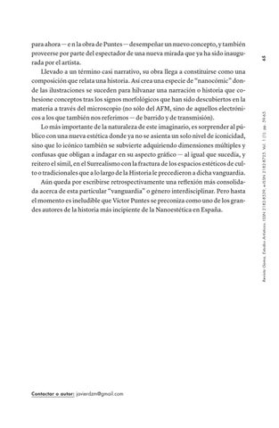para ahora — e n la obra de Puntes — desempeñar un nuevo concepto, y también proveerse por parte del espectador de una nueva mirada que ya ha sido inaugurada por el artista. Llevado a un término casi narrativo, su obra llega a constituirse como una composición que relata una historia. Así crea una especie de “nanocómic” donde las ilustraciones se suceden para hilvanar una narración o historia que cohesione conceptos tras los signos morfológicos que han sido descubiertos en la materia a través del microscopio (no sólo del AFM, sino de aquellos electrónicos a los que también nos referimos — de barrido y de transmisión). Lo más importante de la naturaleza de este imaginario, es sorprender al público con una nueva estética donde ya no se asienta un solo nivel de iconicidad, sino que lo icónico también se subvierte adquiriendo dimensiones múltiples y confusas que obligan a indagar en su aspecto gráfico — al igual que sucedía, y reitero el símil, en el Surrealismo con la fractura de los espacios estéticos de culto o tradicionales que a lo largo de la Historia le precedieron a dicha vanguardia. Aún queda por escribirse retrospectivamente una reflexión más consolidada acerca de esta particular “vanguardia” o género interdisciplinar. Pero hasta el momento es ineludible que Víctor Puntes se preconiza como uno de los grandes autores de la historia más incipiente de la Nanoestética en España.