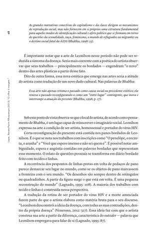 É importante notar que a arte de Leonilson nesse período não pode ser reduzida a sintoma da doença. Seria mais coerente com a poética do artista observar que seus trabalhos — principalmente os bordados — engendram “o novo” dentro das artes plásticas a partir desse fato. Dito de outra forma, essa nova estética que emerge nas artes seria a atitude do artista como tradução de um novo dado cultural. Nas palavras de Bhabha: Essa arte não apenas retoma o passado como causa social ou precedente estético; ela renova o passado reconfigurando-o como um “entre-lugar” contingente, que inova e interrompe a atuação do presente (Bhabha, 1998, p. 27).
