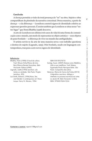 Referências Bhabha, Homi (1998) O local da cultura. Trad. Míryan Ávila/Eliana de Lima Reis/Glaucia Renate Gonçalvez. Belo Horizonte: Editora UFMG. Lagnado, Lisette (1995) Leonilson: são tantas as verdades. São Paulo: Projeto Leonilson, SESI. Luci-Smith, Edward. (1994) Race, Sex, and Gender in contemporary art. Nova Iorque: Harry N. Abrams, 1994.