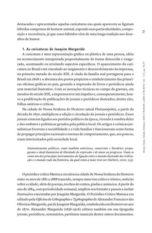 A caricatura é uma representação gráfica ou plástica de uma pessoa, idéia ou acontecimento interpretada propositalmente de forma distorcida e exagerada, acentuando ou revelando aspectos específicos. O aparecimento da caricatura no Brasil está vinculado ao surgimento e desenvolvimento da imprensa, na primeira metade do século XIX. A vinda da família real portuguesa para o Brasil em 1808 e a abertura dos portos propiciou o estabelecimento das primeiras oficinas gráficas no país, gerando a impressão de livros e periódicos ainda sem material ilustrativo. Com as inovações técnicas no campo da gravura, em meados do século XIX, a imprensa teve um impulso e, consequentemente, houve a proliferação de publicações de jornais e periódicos ilustrados, dentre eles, folhas satíricas e críticas. Na cidade de Nossa Senhora do Desterro (atual Florianópolis), a partir da década de 1850, multiplicou a edição e circulação de jornais e periódicos. Esses jornais estavam ligados aos partidos políticos da época, vivendo à sombra deles e dos embates e polêmicas gerados pela política local. Os artigos e crônicas jornalísticas focavam a sociabilidade e a vida familiar e funcionavam como forma de propagar princípios racionais e normas de comportamento, que, aos poucos, eram interiorizados pela sociedade local. Eminentemente políticos, eram também noticiosos, comerciais e literários: propagavam o ideal iluminista de liberdade de expressão e de amor ao progresso. Viam-se como um dos principais instrumentos de ligação entre o mundo ilustrado da civilização e o mundo rude da fronteira, da qual eram a mais viva voz (Siebert, 2001: 235).