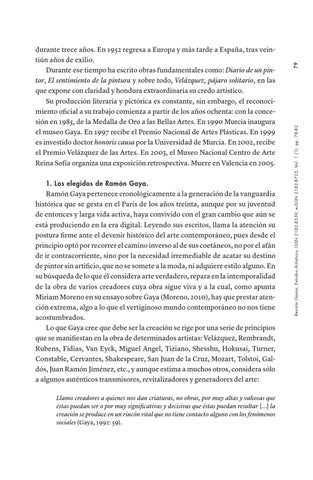 Ramón Gaya pertenece cronológicamente a la generación de la vanguardia histórica que se gesta en el París de los años treinta, aunque por su juventud de entonces y larga vida activa, haya convivido con el gran cambio que aún se está produciendo en la era digital. Leyendo sus escritos, llama la atención su postura firme ante el devenir histórico del arte contemporáneo, pues desde el principio optó por recorrer el camino inverso al de sus coetáneos, no por el afán de ir contracorriente, sino por la necesidad irremediable de acatar su destino de pintor sin artificio, que no se somete a la moda, ni adquiere estilo alguno. En su búsqueda de lo que él considera arte verdadero, repara en la intemporalidad de la obra de varios creadores cuya obra sigue viva y a la cual, como apunta Miriam Moreno en su ensayo sobre Gaya (Moreno, 2010), hay que prestar atención extrema, algo a lo que el vertiginoso mundo contemporáneo no nos tiene acostumbrados. Lo que Gaya cree que debe ser la creación se rige por una serie de principios que se manifiestan en la obra de determinados artistas: Velázquez, Rembrandt, Rubens, Fidias, Van Eyck, Miguel Angel, Tiziano, Shesshu, Hokusai, Turner, Constable, Cervantes, Shakespeare, San Juan de la Cruz, Mozart, Tolstoi, Galdós, Juan Ramón Jiménez, etc., y aunque estima a muchos otros, considera sólo a algunos auténticos transmisores, revitalizadores y generadores del arte: Llamo creadores a quienes nos dan criaturas, no obras, por muy altas y valiosas que éstas puedan ser o por muy significativas y decisivas que éstas puedan resultar [...] la creación se produce en un rincón vital que no tiene contacto alguno con los fenómenos sociales (Gaya, 1992: 59).