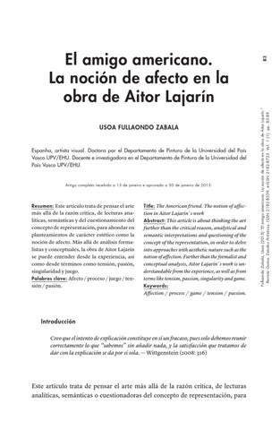 83 Fullaondo Zabala, Usoa (2013) “El amigo americano. La noción de afecto en la obra de Aitor Lajarín.” Revista Gama, Estudos Artísticos. ISSN 2182-8539, e-ISSN 2182-8725. Vol. 1 (1): pp. 83-89.