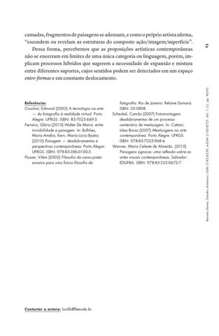 fotografia. Rio de Janeiro: Relume Dumará. ISBN: 02-0808. Schenkel, Camila (2007) Fotomontagem: desdobramentos de um processo centenário de mestiçagem. In: Cattani, Iclea Borsa (2007) Mestiçagens na arte contemporânea. Porto Alegre: UFRGS. ISBN: 978-85-7025-968-4. Wanner, Maria Celeste de Almeida. (2010) Paisagens signicas: uma reflexão sobre as artes visuais contemporâneas. Salvador: EDUFBA. ISBN: 978-85-232-0672-7.