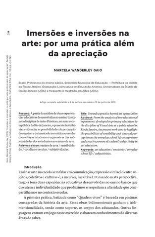 214 Gaio, Marcela Wanderley (2013) “Imersões e inversões na arte: por uma prática além da apreciação.” Revista Matéria-Prima, Práticas Artísticas no Ensino Básico e Secundário. ISSN 2182-9756. Vol. 1 (1), pp. 214-223.
