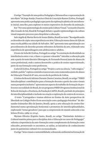O artigo “Exemplo de uma prática Pedagógica: Metamorfose e representação de um objeto” de Jorge Araújo, Francisco Diniz & Conceição Ramos (Lisboa, Portugal) apresenta uma prática pedagógica que parte da exploração plástica de um referente inicial, uma flor, para explorar os meios expressivos do desenho da animação. Em “Por uma epistemologia do ensino pela Cultura Visual,” Leonardo Charréu (Rio Grande do Sul, Brasil & Portugal) debate o quadro epistemológico da cultura visual enquanto processo para despoletar a educação. Inês Argôlo & Marise Berta de Souza (Bahia, Brasil) no texto “Ressignificando os desenhos de cópia: uma experiência em Arte/Educação numa classe de EJA em uma escola pública na cidade de Salvador /BA” apresenta uma aproximação aos procedimentos de desenho perante referentes da história da arte, relatando uma experiência de aprendizagem com adolescentes e adultos. O texto de Sofia Ré (Lisboa, Portugal) no artigo “A construção da identidade na interferência entre o ver, o fazer e o pensar o desenho” introduz a educação pela arte a partir do texto literário (Mensagem, de Fernando Pessoa) junto de alunos do curso profissional, onde a autora desenvolve a prática de ensino supervisionado, parte da sua formação como professora. Carla Gil (Lisboa, Portugal) no artigo “Projeto: a arte na ciência, “cubo mágico,” módulo-padrão” explora conteúdos transversais como matemática junto de alunos de Educação Visual do 8º ano, em escola da periferia de Lisboa. Cristina da Rosa & Adriana Durante (Santa Catarina, Brasil), no artigo “PIBID Interdisciplinar: contribuições para a formação docente a partir das artes visuais numa perspetiva inclusiva” apresenta um aspecto do trabalho de formação de professores na realidade do Brasil, do seu programa PIBID (Programa Institucional de Bolsa de Iniciação a Docência, da Fundação CAPES, Brasil), partindo de princípios de interdisciplinaridade e inclusão na criação e exploração de centros de recursos. O texto “Cartografias e tramas afetivas no Ensino da Arte: perspectivas de liberdade no Colégio Pedro II em associação com a pedagogia-bricoleur” de Alexandre Guimarães (Rio de Janeiro, Brasil), apoia a arte educação do ensino fundamental numa aproximação horizontal e promotora de interdisciplinaridades, explorando ‘temas geradores’ para que a compreensão do mundo anteceda a sua leitura (Freire, 1989: 11; 2014). Myriam Oliveira (Espírito Santo, Brasil), no artigo “Patrimônio Artístico e Cultural matéria prima para a disciplina Arte e Educação no curso de Pedagogia” salienta a importância da auto-formação como complemento da formação como educador, promovendo os encontros, as saídas, as iniciativas de conhecimento junto do património cultural vivo ou musealizado. O artigo “Artes visuais e sustentabilidade: a dimensão ambiental na formação de
