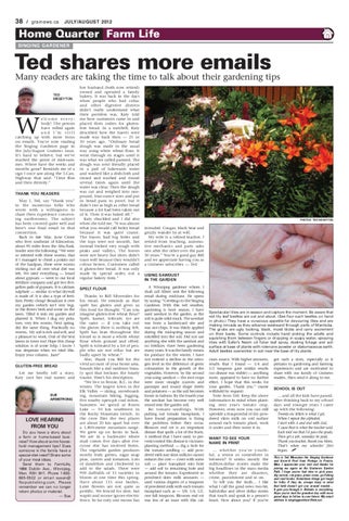 THANK YOU READERS May I, Ted, say “thank you” to the numerous folks who wrote with a willingness to share their experience concerning earthworms. The subject has been covered quite well and here’s one final email in that connection. Back in late May, June Crone who lives southeast of Edmonton, about 90 miles from the Alta./Sask. border sent the following: “We were so infested with these worms, that if I managed to chisel a potato out of the hardpan, there were worms sticking out all over what dirt was left. We tried everything — heard about gypsum — went to our local fertilizer company and got two fivegallon pails of gypsum. It is calcium sulphate — similar to what drywall is made of. It is also a type of fertilizer. Pretty cheap! Broadcast it over my garden (which isn’t very big), in the flower beds and some on the lawn. Tilled it into my garden and planted it. When I dug my potatoes, very few worms. Next spring, did the same thing. Practically no worms. My soil is rich and soft, and a pleasure to work. One of the best lawns in town too! Hope this cheap solution is of some help. I know I was desperate when we tried this. Enjoy your column. June”