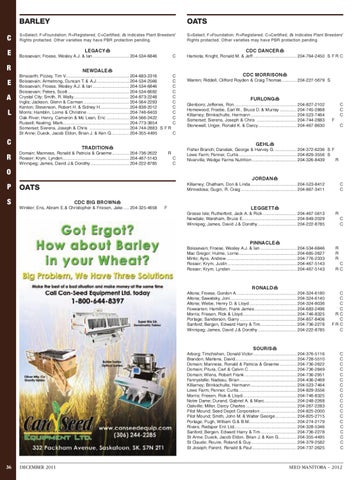SOURISπ Arborg; Timchishen, Donald Victor..................................... 204-376-5116 Brandon; Martens, David.................................................... 204-728-5510 Domain; Manness, Ronald & Patricia & Graeme............... 204-736-2622 Domain; Pitura, Carl & Calvin C......................................... 204-736-2849 Domain; Wiens, Robert Frank............................................ 204-736-2951 Fannystelle; Nadeau, Brian................................................ 204-436-2469 Killarney; Brinkschulte, Hermann....................................... 204-523-7464 Lowe Farm; Penner, Curtis................................................. 204-829-3556 Morris; Friesen, Rick & Lloyd.............................................. 204-746-8325 Notre Dame; Durand, Gabriel A. & Marc............................ 204-248-2268 Oakville; Miller, Darcy Charles........................................... 204-267-2283 Pilot Mound; Seed Depot Corporation............................... 204-825-2000 Pilot Mound; Smith, John M. & Walter George................... 204-825-2715 Portage; Pugh, William G.& B.M......................................... 204-274-2179 Rivers; Redsper Ent. Ltd..................................................... 204-328-5346 Sanford; Bergen, Edward Harry & Tim............................... 204-736-2278 St Anne; Dueck, Jacob Eldon, Brian J. & Ken G................ 204-355-4495 St Claude; Rouire, Roland & Guy...................................... 204-379-2582 St Joseph; Parent, Renald & Paul...................................... 204-737-2625