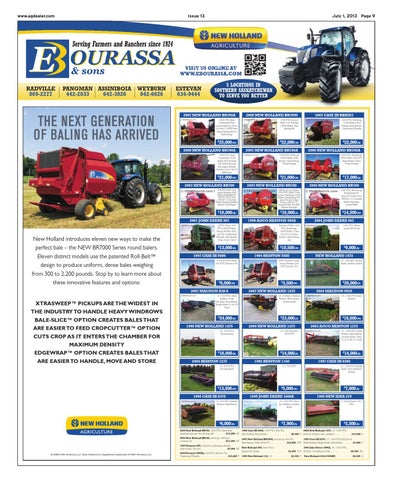 2000 New Holland 1475, 18’, 1000 PTO, 2005 New Holland BR780, 1000 PTO, Autowrap, 1990 Case IH 8460, 1000 PTO, Hyd Tie, standard pickup, Hyd Pickup Lift . . . . . . . . . $14,000 A/F Hyd Pickup, Bale Kicker . . . . . . . . . . . . . . . . . . . $6,000 P Rubber Rollers, user_defined . . . . . . . . . . . . . . $16,500 P 2005 New Holland BR780, netwrap, 1000 pto, 2007 New Holland BR780A, Autowrap, Hyd PU, x sweep pu . . . . . . . . . . . . . . . . . . . . . . . . . . . $21,000 A/F Bale Kicker, Extra Wide PU . . . . . . . . . . . . . $22,000 W/F 1993 Vermeer 505, I Hyd tie, gathering wheels, bale kicker, 540 pto . . . . . . . . . . . . . . . . . . . . . $5,000 R/F New Holland 850, New Floor, Replaced Chains . . . . . . . . . . . . . . . . . . . . . . $2,200 W/F 2003 Vermeer 605XL, 540 PTO, Electric Tie, Gathering Wheels . . . . . . . . . . . . . . . . . . . . . . . $16,000 P 1992 New Holland 116, 16’ . . . . . . . . . . . . . . . $6,500 P