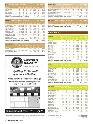 CANOLA YIELDS BY VARIETY 2007–2011† RISK AREA 14 2007 2008 2009 2010 2010 2011 2011‡ Variety Yield Yield Yield Yield Acres Yield Acres 5440 (LT) — 42 31 18 18,956 28 26,676 INVIGOR L150 (LT) — — — — — 30 7,943 INVIGOR L130 (LT) — — — — — 26 5,182 9590 (LT) 18 40 28 13 12,945 27 3,171 5770 (LT) — — — 16 6,171 30 2,086 5020 (LT) 12 36 25 11 9,970 18 1,614 5030 (LT) 20 40 25 19 5,823 26 1,573 8440 (LT) — 37 33 12 5,812 16 948 VT BARRIER (RT) — — — — — 18 861 45H29 (RT) — — — — — 21 788 72-65 (RT) — — — 19 706 21 663 VT500 (RT) — — — — — 28 653 45P70 (ST) 9 918 11 509 16 32 27 WEIGHTED AVERAGE YIELD AND TOTAL ACREAGE§ 26.2 58,940 WHEAT YIELDS BY VARIETY 2007–2011† RISK AREA 14 2007 2008 2009 2010 2010 2011 2011‡ Variety Yield Yield Yield Yield Acres Yield Acres CDC FALCON (W) 61 70 49 52 9,214 62 12,304 GLENN (RS) — — 41 27 18,870 49 11,211 KANE (RS) — — 31 23 5,667 43 6,495 AC DOMAIN (RS) 27 45 26 24 5,564 46 4,475 AC BARRIE (RS) 24 37 29 23 8,142 39 4,119 FALLER (F) — — — — — 54 1,365 5602HR (RS) — 41 28 21 4,961 39 1,224 CDC ALSASK (RS) — — — 21 856 51 1,115 AC CADILLAC (RS) 27 42 30 20 532 48 842 WEIGHTED AVERAGE YIELD AND TOTAL ACREAGE§ 50.3 44,342