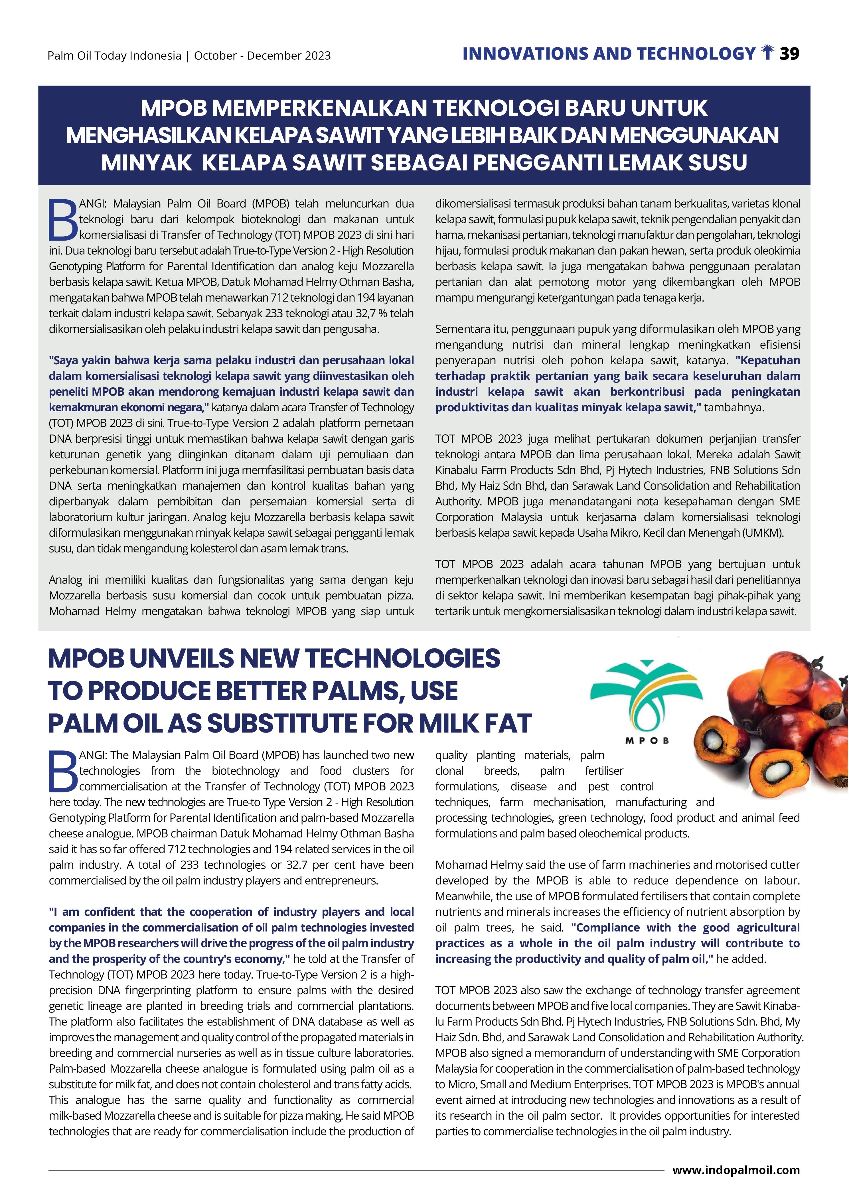 (ENG) MPOB Unveils New Technologies to Produce Better Palms, Use Palm Oil as Substitute for Milk Fat