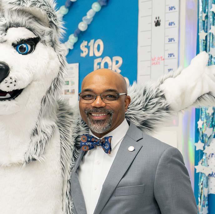 Beaming with pride Principal of the Year Kristi Durham celebrates alongside her school’s spirited mascot—the Huskie—and Superintendent Dr. Marc Smith at Madden Elementary.