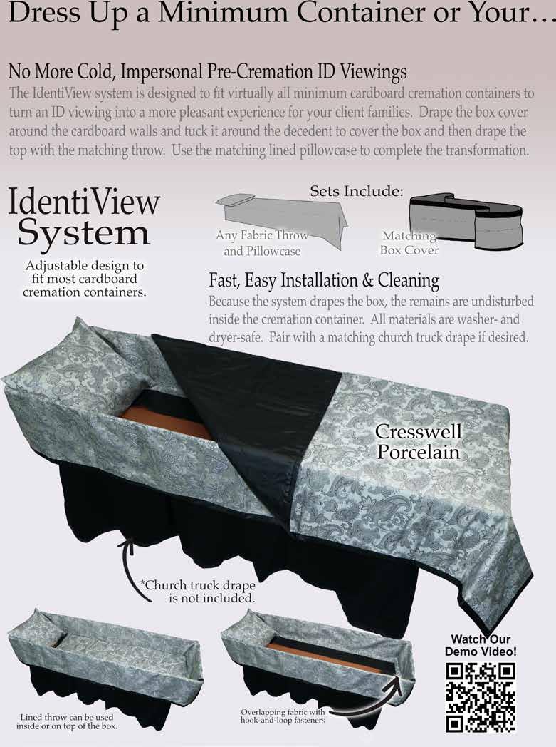 “Many direct cremation-choosing families believe the body is cremated without considering issues related to body handling, such as storage, transportation, safety, and positive identification,” said Arie Elder, VP of Merchandising for Starmark™ Funeral Products. “Educating families and providing intuitive cremationfriendly options will allow funeral directors to discover a great benefit when understanding that one or more immediate family members will want to identify their loved one or hold a brief goodbye in a comfortable setting”.