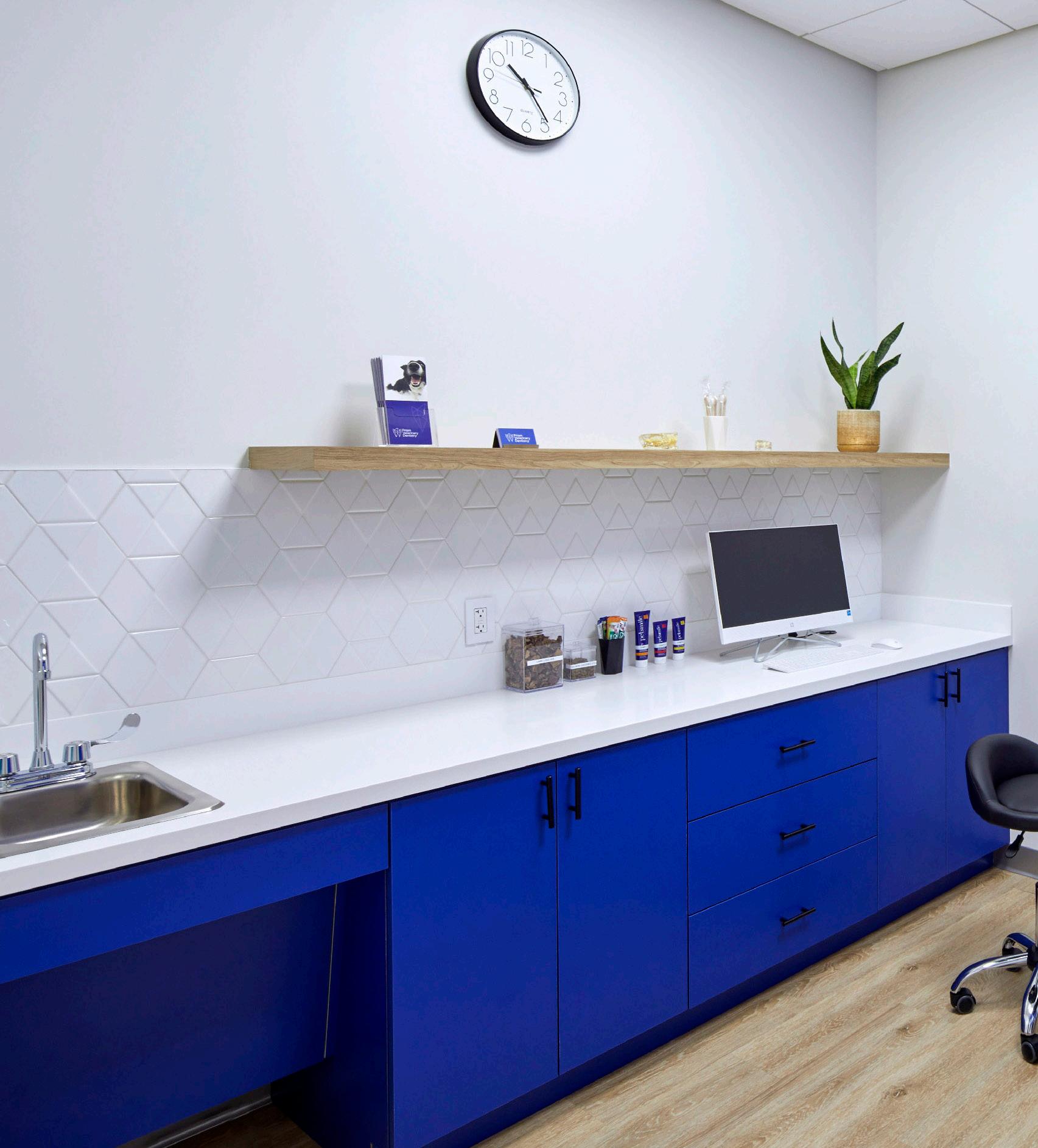 Behind the reception desk is a feature wall that becomes the centerpiece of the space by utilizing varying depths and integrated lighting to cast playful shadows and create breaks leading to the ceiling. The bold blue accent introduced here extends to the ceiling and sidewalls, effectively framing the reception space. Continuing the language introduced by the feature wall, the enclosed banquette offers an intimate seating area, thoughtfully positioned within the high-ceiling space and reducing the scale. Similar to concerns raised for humans with the prospect and refuge theories, this smaller more intimate space provides comfort and security for waiting pets and their families.