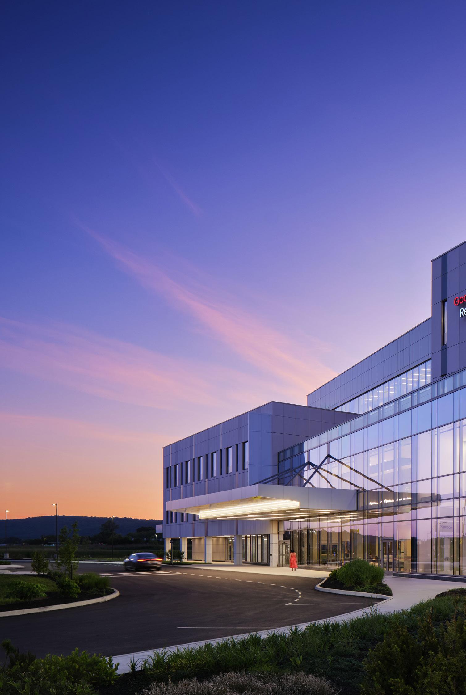 FCA and Virtua transformed a former supermarket into a state-of-the-art cancer treatment facility, housing radiation oncology, infusion suites, and administrative spaces. The design prioritizes patient comfort with controlled natural light, a soothing “white box” exterior symbolizing optimism, glowing interior elements for wayfinding, and a serene garden visible from treatment areas, creating an uplifting environment for care.