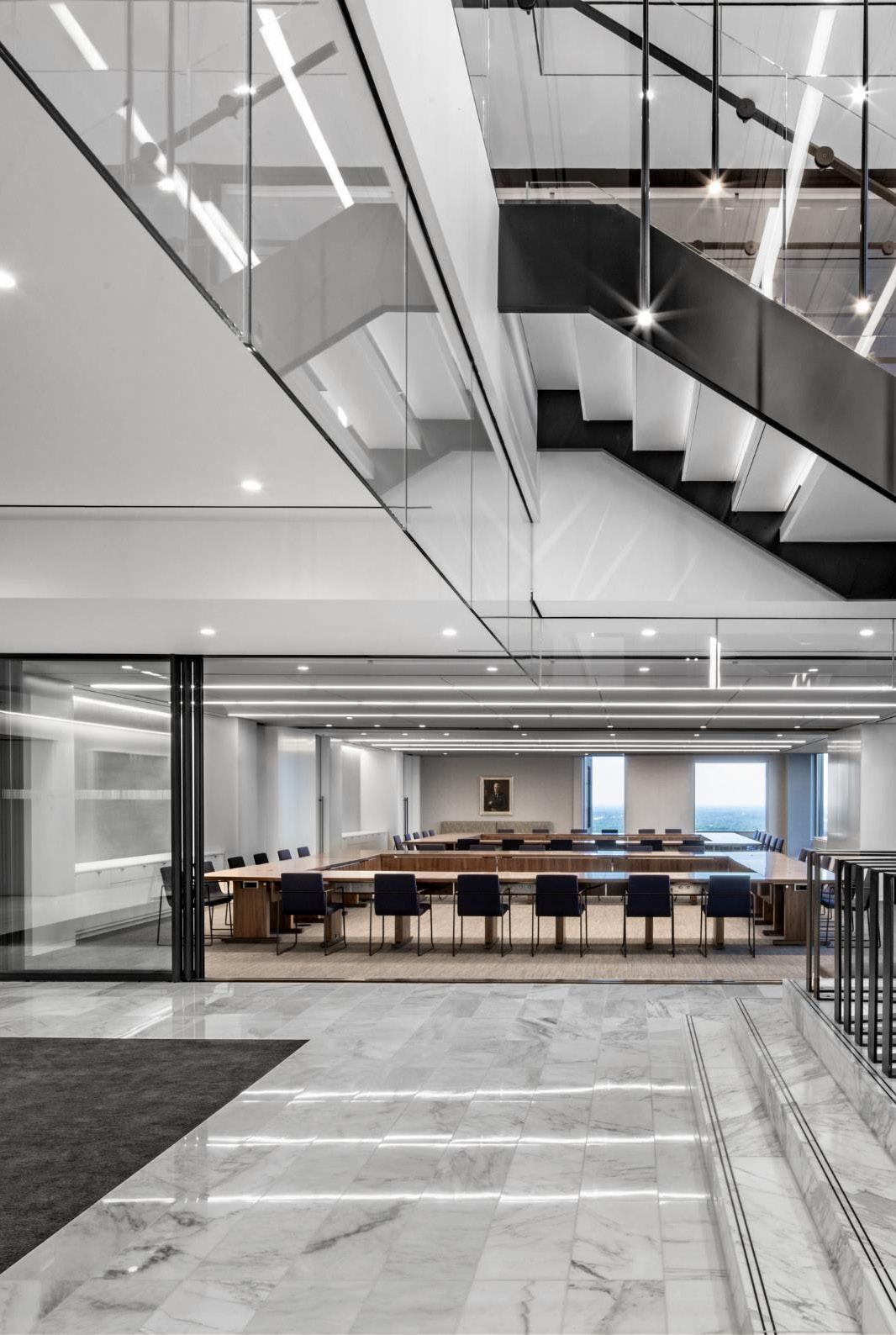 Troutman Sanders’ Atlanta office relocation to nine contiguous floors blends tradition, transparency, and flexibility with a focus on wellness. The design features universal-sized offices, centralized resource centers, and all-glass office fronts for natural light and views. Highlights include a two-story conference center with a sculptural staircase, town center-inspired café hubs, and historical photos celebrating the firm’s legacy as an original tenant, creating a dynamic and collaborative workspace.