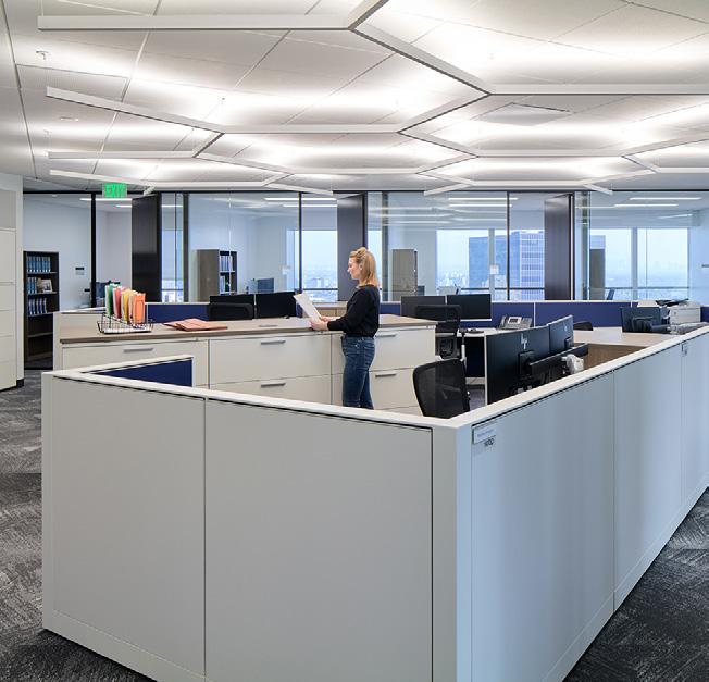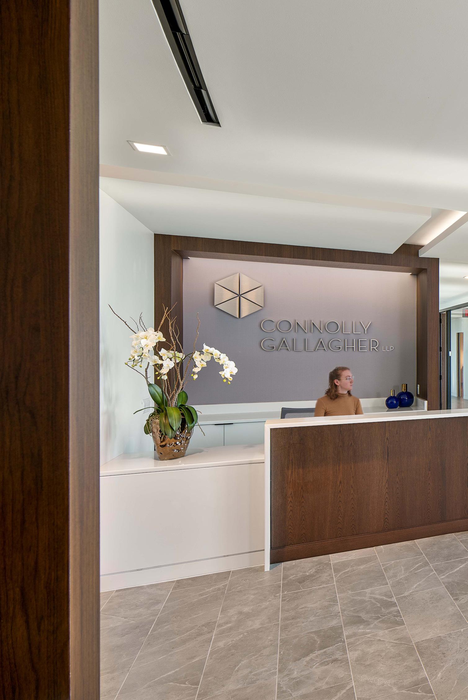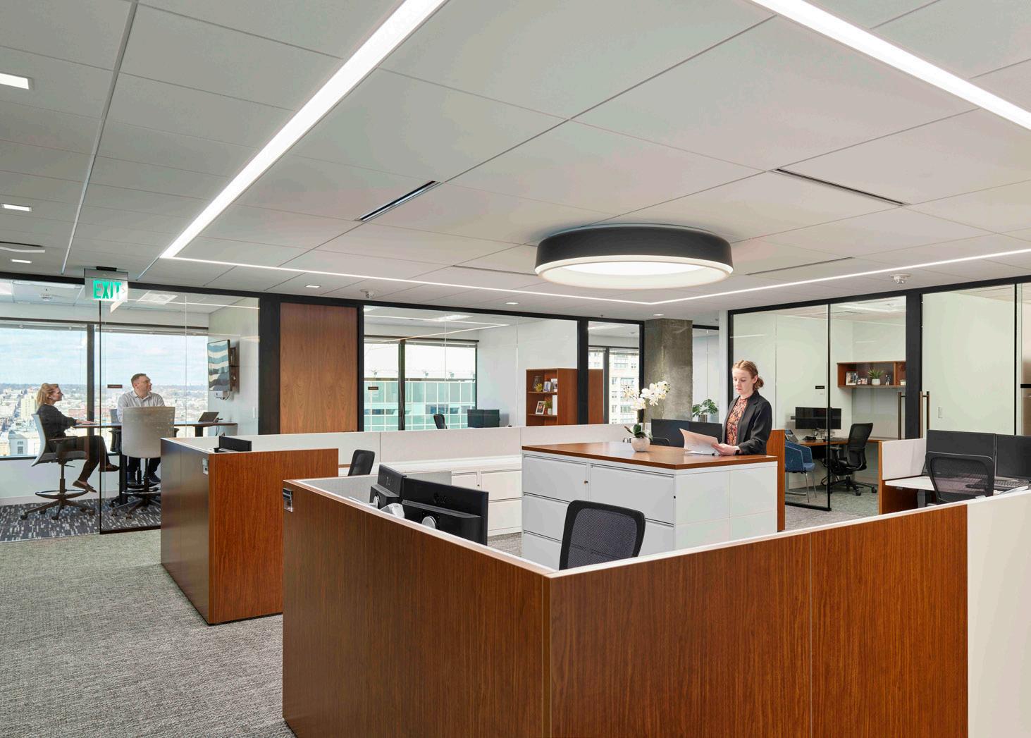 Connolly Gallagher’s new office on the 20th floor of a high-rise in the central business district reflects their agile and employeefocused culture. With unobstructed views of the city and Delaware River, the firm prioritized staff well-being by placing the employee lounge in the prime river-facing location—a first for the building. The space features clean, modern design, highlighted by a striking reception wall inspired by their logo and vibrant artwork from local nonprofit Fresh Artists, allowing the views and creative elements to take center stage.