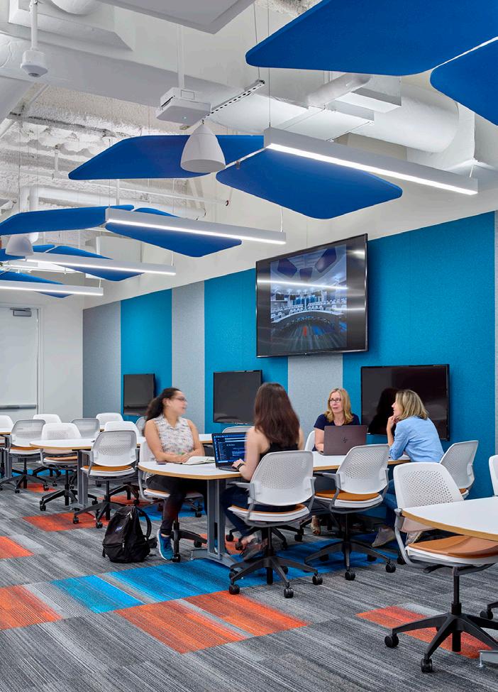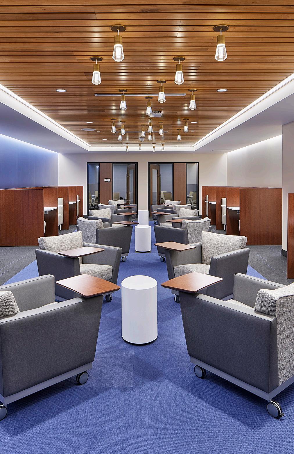 – Movement-oriented zones designed to accommodate self-study, group collaboration, team-based activities, and informal student interaction.