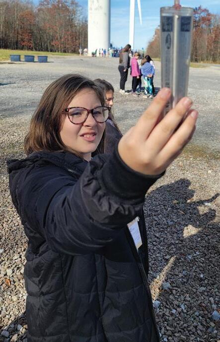 A Kerr Elementary School student conducts an experiment at a wind farm as part of the district’s fifth-grade Camp Allegheny environmental experience.