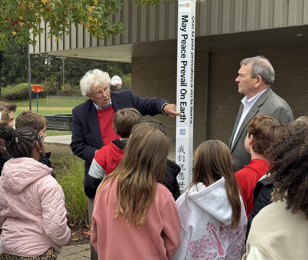 Each school held a special ceremony to commemorate the donation of its Peace Pole. Dr. Dull attended each ceremony, as did other members of the Rotary Club. He spoke about the powerful phrase, “May Peace Prevail on Earth.”