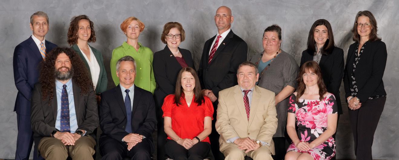 Front row, left to right: Adam G. Goode (2029 – Region III); Eric G. Hamilton, Treasurer (2027 – Region I); Marybeth Dadd, President (2027 – Region III); Ronald P. Frank, Vice President (2027 – Region II); and Vanessa K. Lynch, Assistant Secretary (2027 – Region II). Back row, left to right: Paul Giuffre, Solicitor; Ariel Zych (2029 – Region II); Katie Findley (2027 – Region I); Dr. Mary Catherine Reljac, Superintendent; Dr. David P. McCommons, Deputy Superintendent; Amy B. Cooper (2029 – Region I); Dr. Jessica Haselkorn (2029 – Region III); and Kathleen Anuszek, Board Secretary.