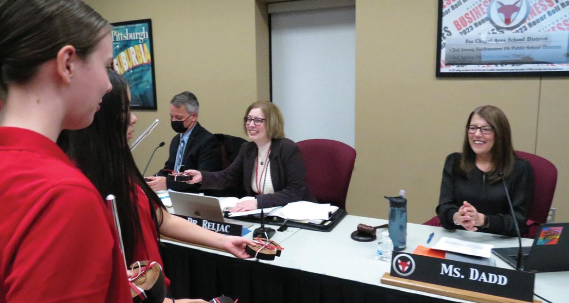 Students from Dorseyville Middle School honored members of the Fox Chapel Area School Board in recognition of School Director Recognition Month, which is observed in January. The seventh-grade flute ensemble performed an arrangement of the national anthem, followed by “Edelweiss” from “The Sound of Music.” The students, who are also members of the DMS honors band, are Rebecca Dorneich, Celestial Hou, Delaney Liu, Zoey Liu, and Brooke Nalevanko. The students also presented the board with fox-themed coasters, made in the DMS makerspace, as a token of gratitude for their leadership.