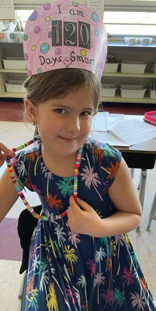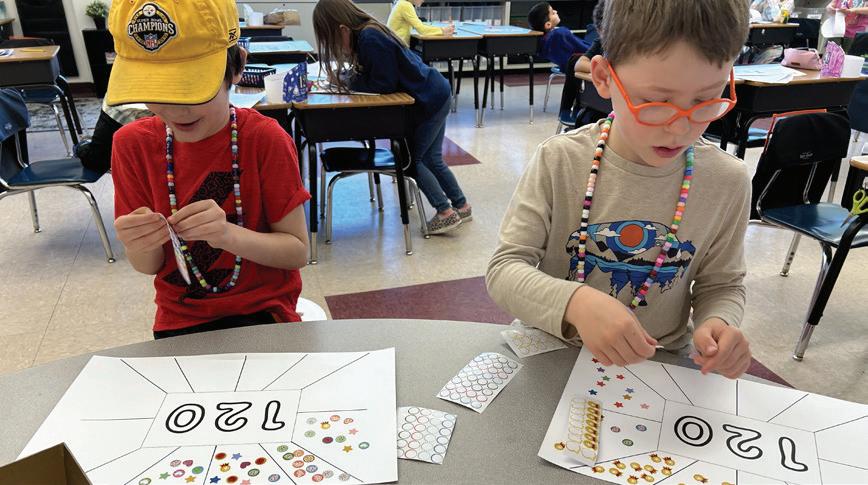 First-grade students at O’Hara Elementary School celebrated the 120th day of school in early March with fun activities that included coloring special hats to wear, making artwork that each contained 120 stickers, and sorting and stringing 120 beads. The celebration was a culmination of their work to be able to count to at least 120.