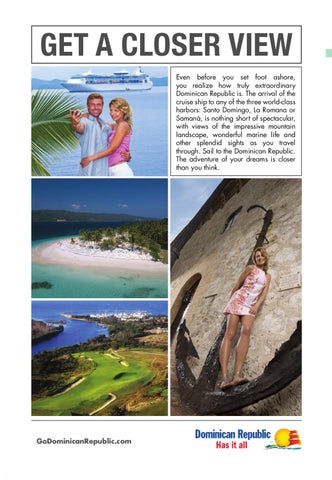 GET A CLOSER VIEW Even before you set foot ashore, you realize how truly extraordinary Dominican Republic is. The arrival of the cruise ship to any of the three world-class harbors: Santo Domingo, La Romana or Samanรก, is nothing short of spectacular, with views of the impressive mountain landscape, wonderful marine life and other splendid sights as you travel through. Sail to the Dominican Republic. The adventure of your dreams is closer than you think.