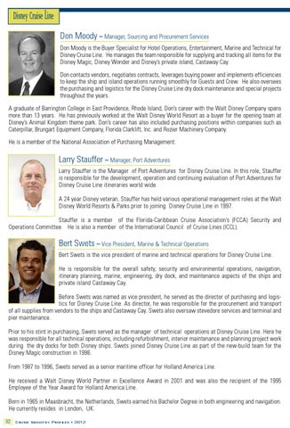Disney Cruise Line Don Moody ~ Manager, Sourcing and Procurement Services Don Moody is the Buyer Specialist for Hotel Operations, Entertainment, Marine and Technical for Disney Cruise Line. He manages the team responsible for supplying and tracking all items for the Disney Magic, Disney Wonder and Disney’s private island, Castaway Cay. Don contacts vendors, negotiates contracts, leverages buying power and implements efficiencies to keep the ship and island operations running smoothly for Guests and Crew. He also oversees the purchasing and logistics for the Disney Cruise Line dry dock maintenance and special projects throughout the years. A graduate of Barrington College in East Providence, Rhode Island, Don’s career with the Walt Disney Company spans more than 13 years. He has previously worked at the Walt Disney World Resort as a buyer for the opening team at Disney’s Animal Kingdom theme park. Don’s career has also included purchasing positions within companies such as Caterpillar, Brungart Equipment Company, Florida Clarklift, Inc. and Rozier Machinery Company. He is a member of the National Association of Purchasing Management.