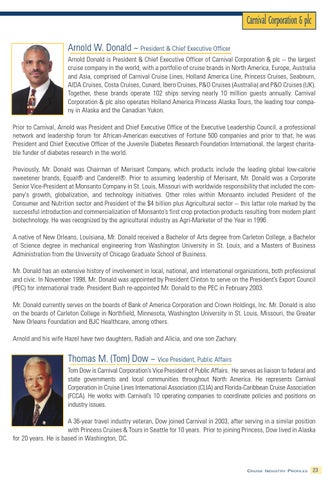 Carnival Corporation & plc Arnold W. Donald ~ President & Chief Executive Officer Arnold Donald is President & Chief Executive Officer of Carnival Corporation & plc -- the largest cruise company in the world, with a portfolio of cruise brands in North America, Europe, Australia and Asia, comprised of Carnival Cruise Lines, Holland America Line, Princess Cruises, Seabourn, AIDA Cruises, Costa Cruises, Cunard, Ibero Cruises, P&O Cruises (Australia) and P&O Cruises (UK). Together, these brands operate 102 ships serving nearly 10 million guests annually. Carnival Corporation & plc also operates Holland America Princess Alaska Tours, the leading tour company in Alaska and the Canadian Yukon. Prior to Carnival, Arnold was President and Chief Executive Office of the Executive Leadership Council, a professional network and leadership forum for African-American executives of Fortune 500 companies and prior to that, he was President and Chief Executive Officer of the Juvenile Diabetes Research Foundation International, the largest charitable funder of diabetes research in the world. Previously, Mr. Donald was Chairman of Merisant Company, which products include the leading global low-calorie sweetener brands, Equal® and Canderel®. Prior to assuming leadership of Merisant, Mr. Donald was a Corporate Senior Vice-President at Monsanto Company in St. Louis, Missouri with worldwide responsibility that included the company's growth, globalization, and technology initiatives. Other roles within Monsanto included President of the Consumer and Nutrition sector and President of the $4 billion plus Agricultural sector -- this latter role marked by the successful introduction and commercialization of Monsanto’s first crop protection products resulting from modern plant biotechnology. He was recognized by the agricultural industry as Agri-Marketer of the Year in 1996. A native of New Orleans, Louisiana, Mr. Donald received a Bachelor of Arts degree from Carleton College, a Bachelor of Science degree in mechanical engineering from Washington University in St. Louis, and a Masters of Business Administration from the University of Chicago Graduate School of Business. Mr. Donald has an extensive history of involvement in local, national, and international organizations, both professional and civic. In November 1998, Mr. Donald was appointed by President Clinton to serve on the President’s Export Council (PEC) for international trade. President Bush re-appointed Mr. Donald to the PEC in February 2003. Mr. Donald currently serves on the boards of Bank of America Corporation and Crown Holdings, Inc. Mr. Donald is also on the boards of Carleton College in Northfield, Minnesota, Washington University in St. Louis, Missouri, the Greater New Orleans Foundation and BJC Healthcare, among others. Arnold and his wife Hazel have two daughters, Radiah and Alicia, and one son Zachary.