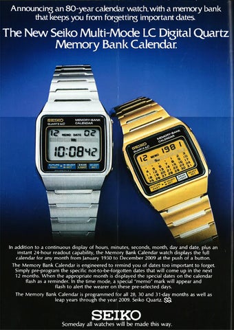 The Memory Bank Calendar is programmed for all28,30 and 31-day months as well as leap years through the year 2009. Seiko Quartz. Sâ