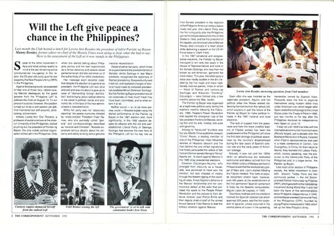 speaker from the "Philippine Left" to address the Club on August 1 3. To our pleasant surprise, however, the speaker turned out to be a soft-spoken yet gl¡b, mild-mannered but self-assured, pixielooking schoolmarm. lndeed, Loreta Ann "Eta" Rosales, a professor of social sciences at the staterun University of the Philippines, looked anything but the president of Partido ng Bayan, the only visible political organisation of the Left in the Philippines. Only