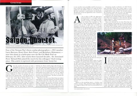 Four of the Vietnam War's finest combat photographers FCC member Larry Burrows, Flenri Huet, Kent Potter, and Keisaburo Shim¿¡¡sts were shot down in a helicopter over the Ho Chi Minh Trail on February I0,I97I. After nearly three haunted decades, the Associated Press' Richard Pyle joined the search for his colleagues' final restingplace. This article is reprinted with permission from Vanity Fair. iven the member of cameras on hand, remarkably few pictures were taken that day. But to the half dozen photographers and reporters rvho watched the helicopters depart, the details are indelible. To these correspondents, and to scores who covered the conflict, February 10, 1971, was perhaps the most tragic day of the Vietnam War the day that four of - down without a trace. their own, four of their best, went After the crash, Henri Huet's fiancée, the Swedish journalist Inger-Johanne Holmboe, wrote to Asia hands, to diplomats in Hanoi and elsewhere, to anyone who might have been able to help. "If nothing happens, I am going to find him myself," she added in longhand at the bottom of one letter. For a number of years, Holmboe, now 55 and living in Stockholm, 10