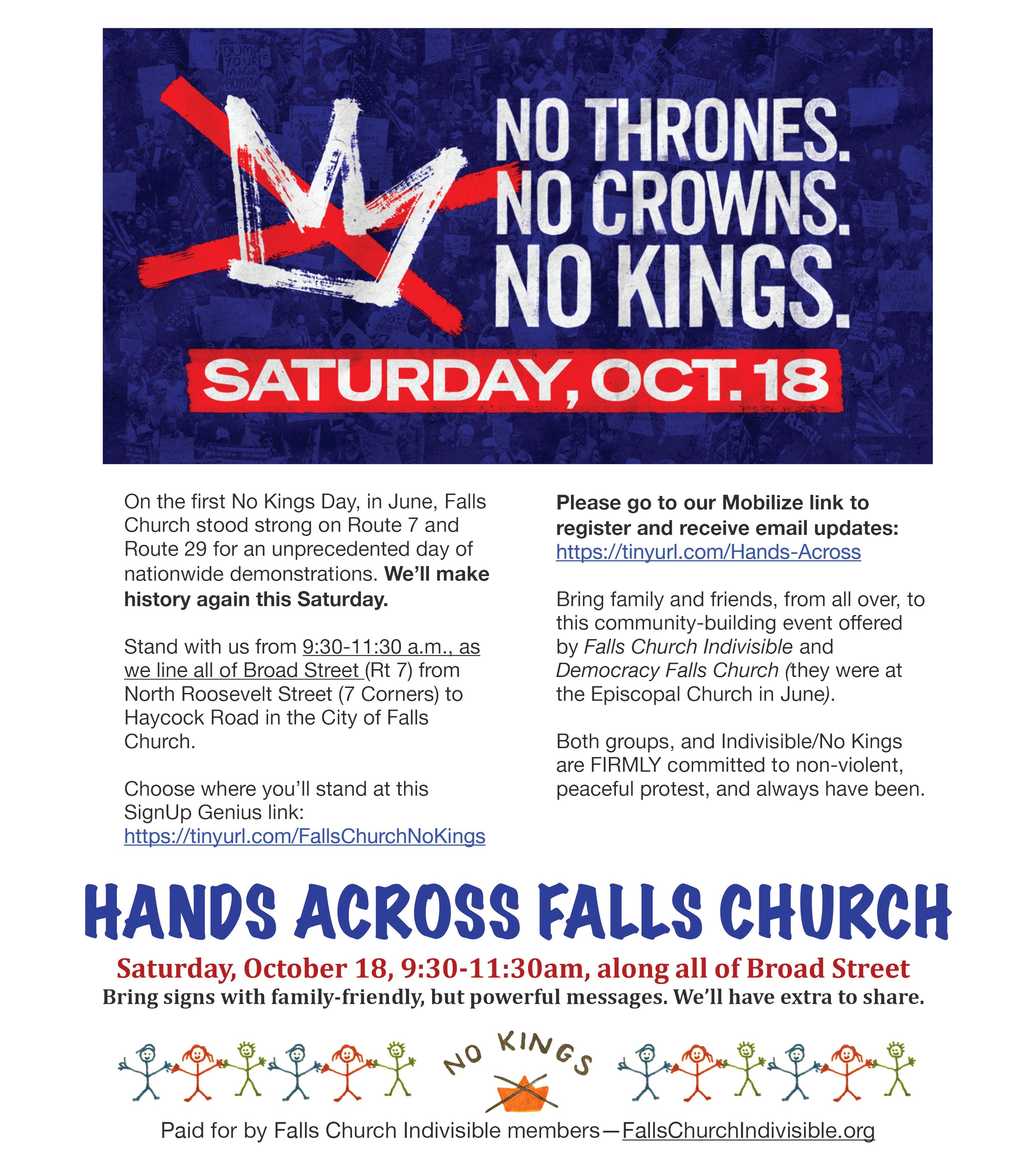 Amid more than 2,500 similar events nationwide, a “No Kings” rally in the City of Falls Church is expected to draw a huge turnout of citizens lining Broad Street (Rt. 7) from endto-end this Saturday morning, Oct. 18. The rally is set as a participant in “the biggest day of non-violent protest in U.S. history, designed to show love for community, country and democracy,” organizers say.