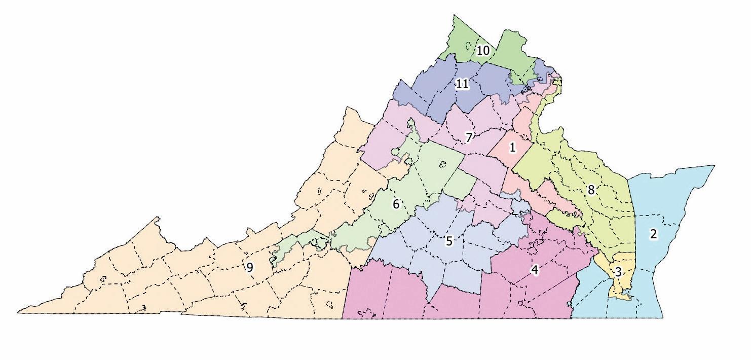 Adjacent Falls Church, Fairfax County would be split into five congressional districts, with portions of the county assigned to the newly configured 7th, 8th, 10th, and 11th districts.