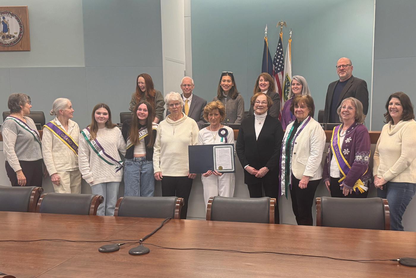 A FALLS CHURCH City Council proclamation declaring March 2026 Women’s History Month was received by a contingent of prominent Falls Church women this Monday: (l. to r. in foreground) Julie Krachman, Cindy Garner, Danielle Hauptmann, Marianne Meade, Marty Behr, Sally Ekfelt, Sharon Schoeller, Marty Meserve, Cindy Mester, and Beth Hahn. F.C. Council members are behind them. (Photo: News-Press)