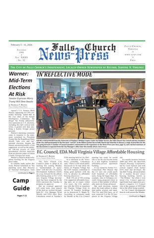 The City of Falls Church’s Independent, Locally-Owned Newspaper of Record, Serving N. Virginia Falls Church, Virginia • www.fcnp.com • Free Founded 1991 • Vol. XXXIII No 5 News Briefs..............................................2 Comment..........................................6,7,20 Editorial 6 Crime Report...........................................20 News & Notes....................................22,23 School News 24 Calendar 26,27 Classifieds...............................................28 Business News.......................................31 Continued on Page 4 Index Inside This Week Key Environmental Dev elopment Hailed