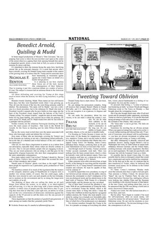 Donald Trump faces a stark choice. He can tweet, or he can govern. He can indulge his persecution complex, firing off missives that compare Barack Obama to Joseph McCarthy and U.S. intelligence officers to Nazis, or he can recognize it as a gateway to disgrace and irrelevance. He can make his presidency about his own viscera, or he can make it about the country’s welfare. He can do what feels cathartic in the moment, or he can do what’s constructive in the long run. He can NEW YORK TIMES NEWS SERVICE dabble in bright colors and shiny objects, or he can deal in durable truths. I’m focusing on Twitter because it teases out his worst traits. It’s the theater for vainglorious, vindictive, impulsive Trump, and it was the realm in which he made the wild accusations that Obama had wiretapped Trump Tower. On Monday, James Comey debunked those charges, certifying them as the gaseous fulminations we more or less knew they were. And through much of Tuesday, Trump’s personal Twitter account essentially went dark. There was nothing from the hours around dawn, which is when he typically visits with his darkest vapors. There was only anodyne stuff later on: a shout-out to the scientists at NASA, a salute to U.S. farmers. Either someone in his orbit convinced him, at least briefly, of the damage he was doing and the miserable situation he’s in, or Trump himself summoned some wisdom and restraint. He must be capable of that. Can he continue it? It could be argued that every presidency is a tug of war between private demons and the public interest, between the commander in chief’s indulgence of his own psychological needs and his attentiveness to the hard work of America. With Trump it’s a furiously pitched battle, and the demons are way out ahead. One of them hasn’t received the attention it warrants. With all our condemnations of Trump the bully, we’ve overlooked Trump the bullied, which is the version more likely to bring him down. I mean the Trump who’s hellbent on believing that he’s up against ruthless enemies; the Trump who must amplify every stride by casting it as a triumph over formidable odds; the Trump who’s throwing a pity party for himself the likes of which few of his predecessors ever attempted. His election somehow brought this Trump to the fore. In a paradox as strange as everything else about