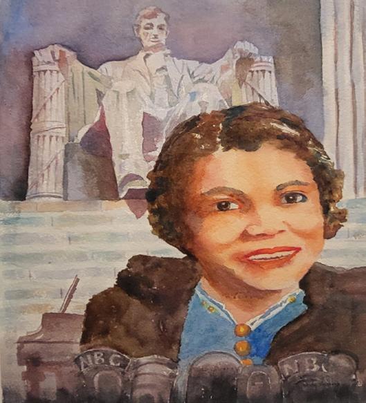 In the exhibition, moments from American history are showcased. We were particularly reminded of the history of Marion Anderson in “Merete Evans’ poignant watercolor “When the Nation Listened.”