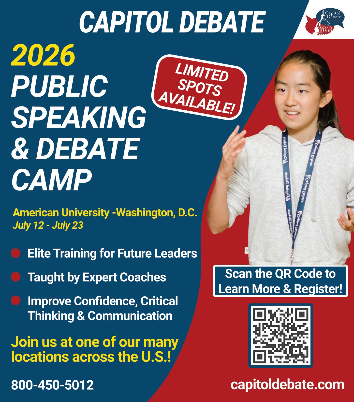 That’s the pitch behind Capitol Debate, which runs public speaking and debate camps in the region, including programs hosted on nearby college campuses such as American University in Washington, D.C. and Marymount University in Arlington.