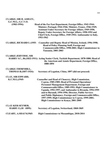 CLARKE-JERVOISE, SIR HARRY S.C., Bt.(1832-1911): Acting Senior Clerk, Turkish Department, 1878-1880; Head of the American and Asiatic Department, Foreign Office, 1880-1894 CLARKE-THORNHILL, THOMAS B.(1857-1934): CLAY, SIR EDWARD, K.C.M.G.(1945-