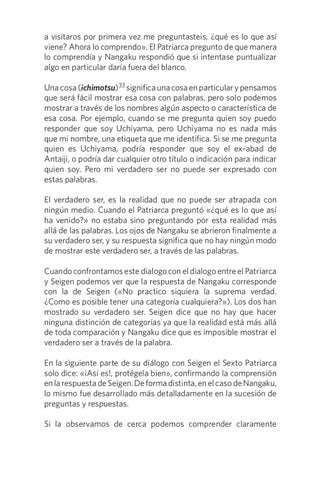 a visitaros por primera vez me preguntasteis, ¿qué es lo que así viene? Ahora lo comprendo». El Patriarca pregunto de que manera lo comprendía y Nangaku respondió que si intentase puntualizar algo en particular daría fuera del blanco. Una cosa (ichimotsu)33 significa una cosa en particular y pensamos que será fácil mostrar esa cosa con palabras, pero solo podemos mostrar a través de los nombres algún aspecto o característica de esa cosa. Por ejemplo, cuando se me pregunta quien soy puedo responder que soy Uchiyama, pero Uchiyama no es nada más que mi nombre, una etiqueta que me identifica. Si se me pregunta quien es Uchiyama, podría responder que soy el ex–abad de Antaiji, o podría dar cualquier otro título o indicación para indicar quien soy. Pero mi verdadero ser no puede ser expresado con estas palabras. El verdadero ser, es la realidad que no puede ser atrapada con ningún medio. Cuando el Patriarca preguntó «¿qué es lo que así ha venido?» no estaba sino preguntando por esta realidad más allá de las palabras. Los ojos de Nangaku se abrieron finalmente a su verdadero ser, y su respuesta significa que no hay ningún modo de mostrar este verdadero ser, a través de las palabras. Cuando confrontamos este dialogo con el dialogo entre el Patriarca y Seigen podemos ver que la respuesta de Nangaku corresponde con la de Seigen («No practico siquiera la suprema verdad. ¿Como es posible tener una categoría cualquiera?»). Los dos han mostrado su verdadero ser. Seigen dice que no hay que hacer ninguna distinción de categorías ya que la realidad está más allá de toda comparación y Nangaku dice que es imposible mostrar el verdadero ser a través de la palabra. En la siguiente parte de su diálogo con Seigen el Sexto Patriarca solo dice: «¡Así es!, protégela bien», confirmando la comprensión en la respuesta de Seigen. De forma distinta, en el caso de Nangaku, lo mismo fue desarrollado más detalladamente en la sucesión de preguntas y respuestas. Si la observamos de cerca podemos comprender claramente