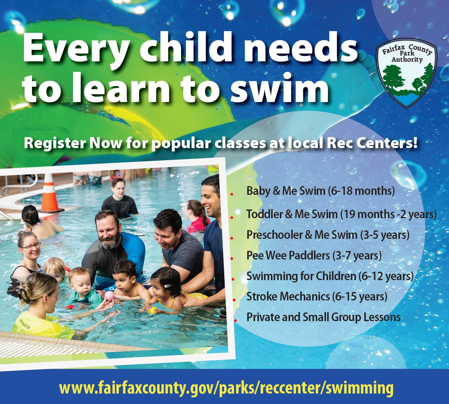 If you do not know how to swim or need a refresher course, the Park Authority has several options to suit your needs. Group classes are offered quarterly from beginners to advanced classes for those wanting to work on Stroke Mechanics. For more individualized attention, Rec Centers offer small group and private lessons.