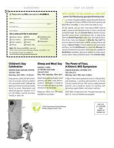 MAIL TO: Resources/RMD, Suite 936 12055 Government Center Parkway • Fairfax, VA 22035-1118 or: subscribe through our website at www.fairfaxcounty.gov/parks/resources
