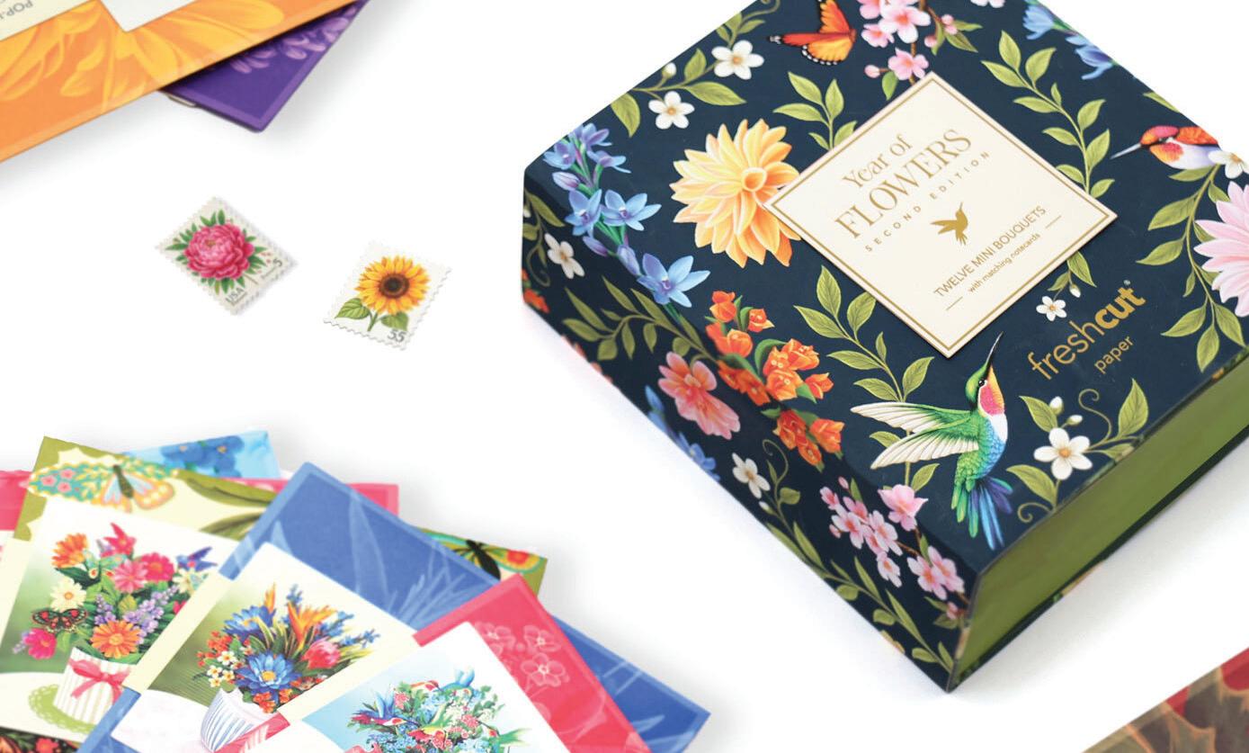 Celebrate every season with FreshCut Paper’s Second Edition of the best-selling Year of Flowers Box Set. This beautiful keepsake box holds twelve mini bouquets with matching note cards — a stunning mix of brand-new designs and beloved favorites. Perfect for sharing smiles and love all year long.