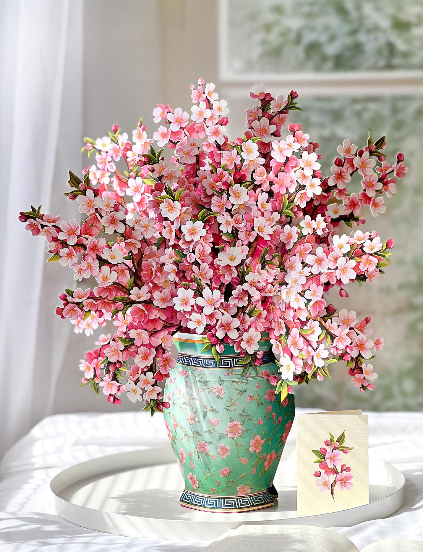 With soft pink petals that symbolize renewal and the quiet beauty of spring, this elegant, grand gesture captures nature’s fleeting magic, while blooming year-round in an ornate jade-inspired vase.