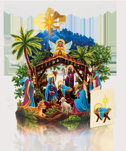 Rejoice in the spirit of Christmas with our pop-up Starlit Nativity scene. Beneath Bethlehem’s glowing night sky, the evening of Christ’s birth comes to life in a spectacular 3 dimensional display. This beautiful gift and keepsake is sure to bring blessings to you and your loved ones.